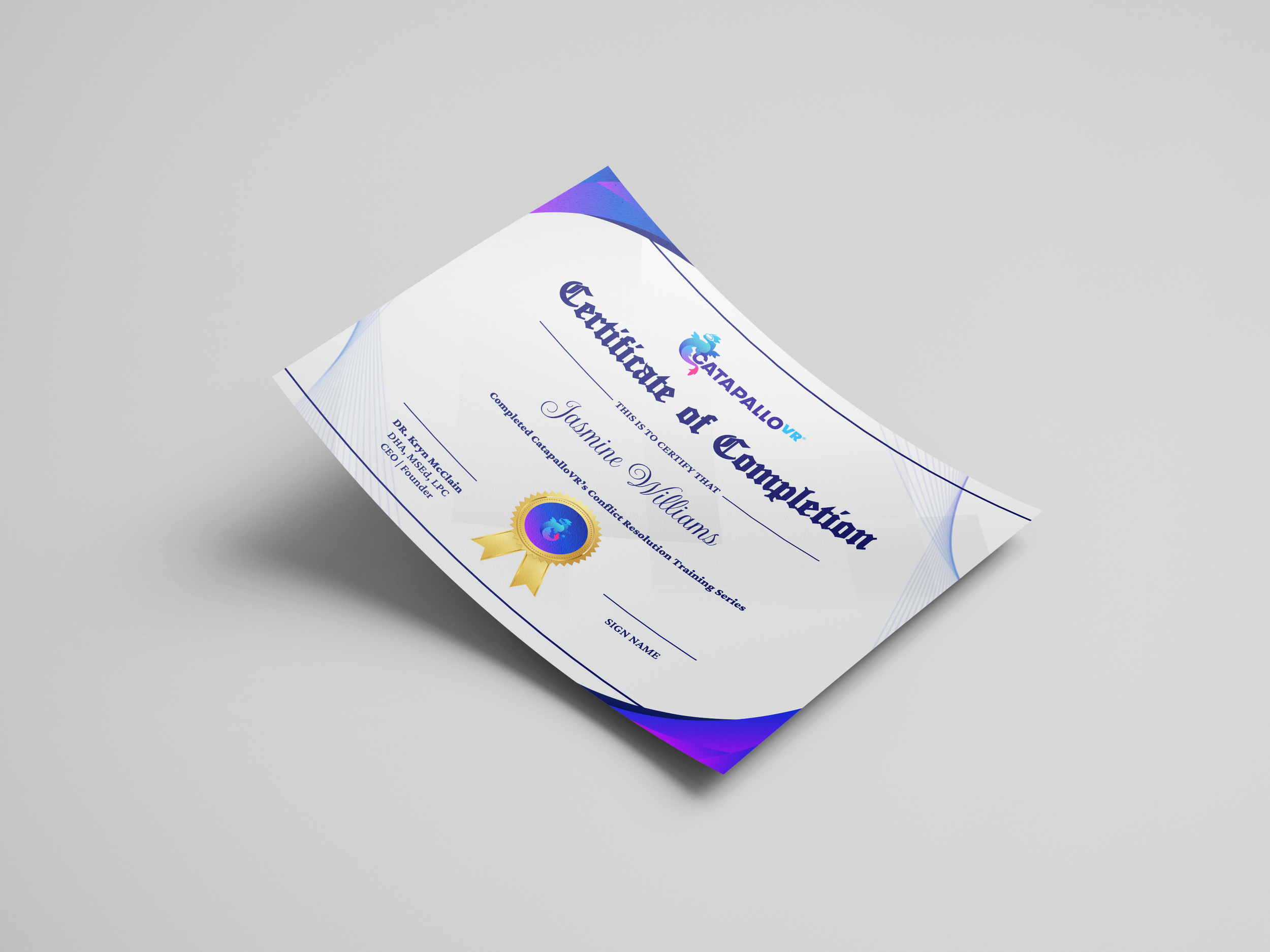 For this project, I was tasked with designing a Certificate of Achievement for individuals who complete all of Catapollo VR’s training modules. The certificate was crafted to reflect the company’s brand identity, incorporating its core colors and logo. I aimed for an elegant and professional aesthetic, using fine linework and regal typefaces such as Old English to convey a sense of prestige and accomplishment.